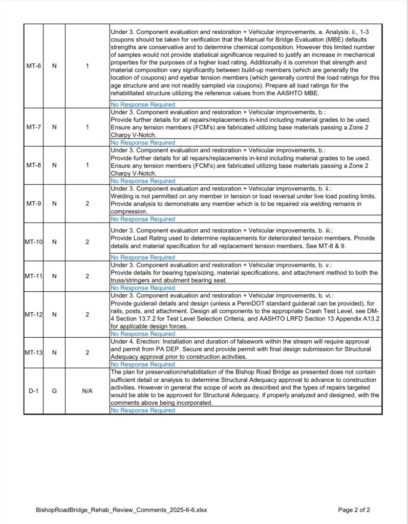 In our opinion, the best course of action is to rehabilitate the bridge for limited vehicular use and to seek the cooperation of Messiah University in allowing the public to utilize the County built emergency access road as a walking trail connection to the stunningly beautiful Bishop Road area and bridge.