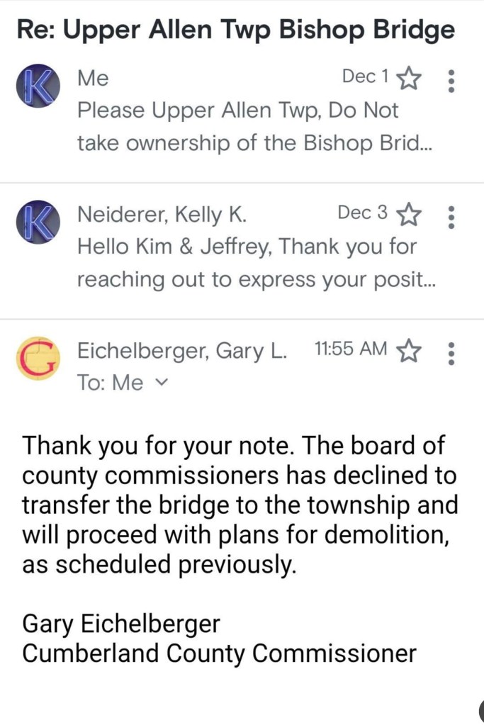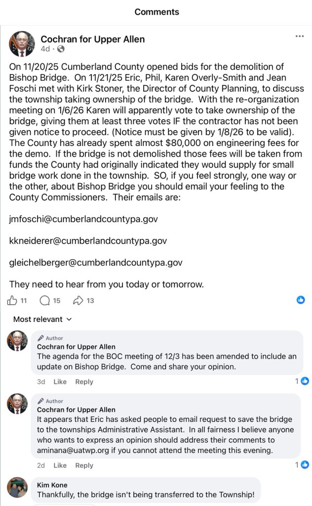 How did this happen? Basically, outgoing Upper Allen Commissioner Jim Cochran orchestrated a Facebook campaign to flood the County Commissioners with emails. His Cochran for Upper Allen page shows people opining about the bridge – some without even knowing where it is – and the County Commissioners responding.