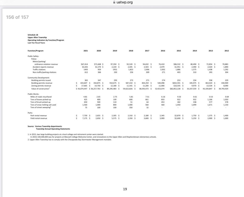 Upper Allen has a unnecessarily complicated budget structure using 13 separate funds, multiple transfers between funds, and repetitive data entries to create a 147 page document for 2023. By comparison, Middlesex and South Middleton Townships have 9 and 32 page budget documents respectively.