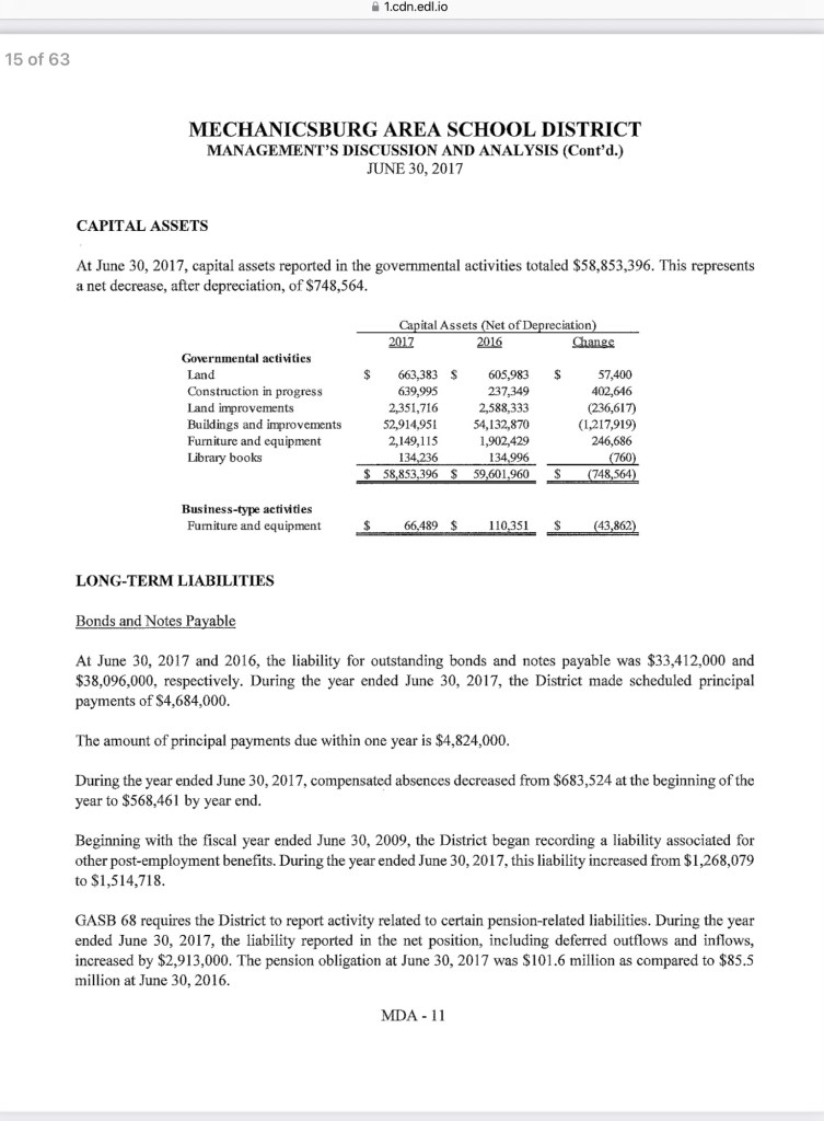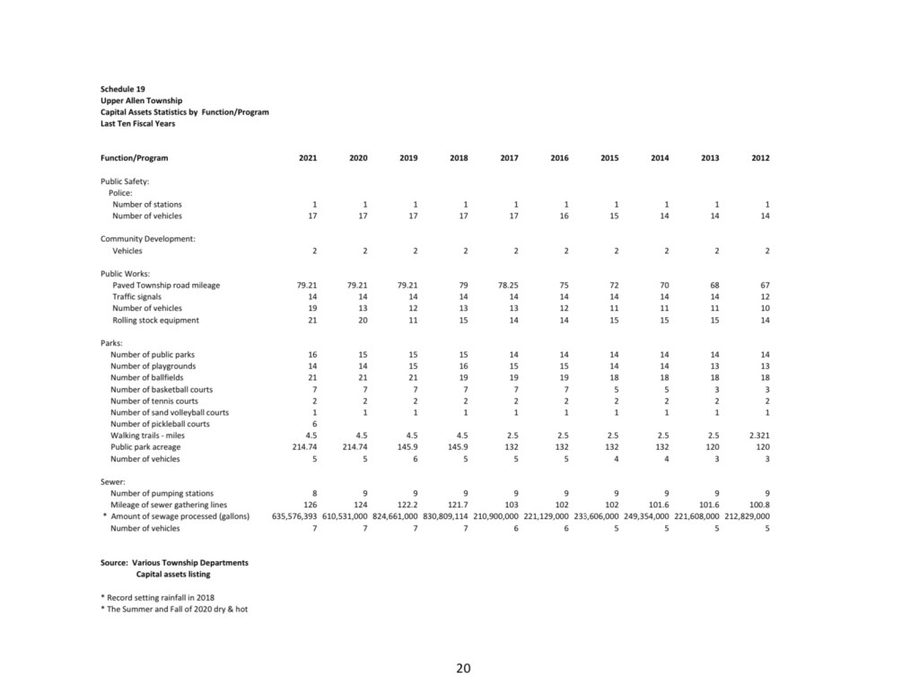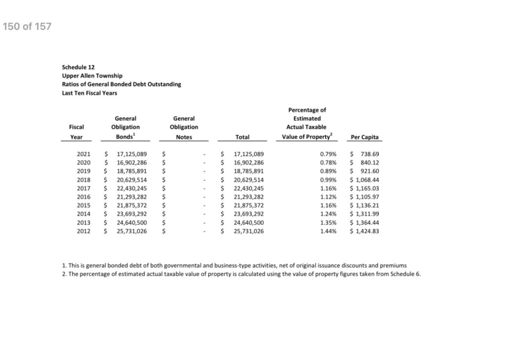 This report is required by the State and provides a wealth of other information such as demographics, largest taxpayers, largest employers, “overlapping” tax rates and debt (with school district and county), operating metrics, capital assets, etc. Note that some information excludes “business type activities” such as the sewer and storm water authorities.