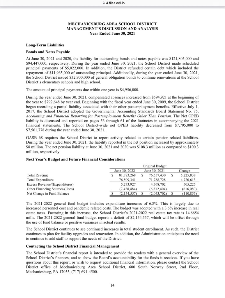 Mechanicsburg Area School District presents financial reports going back to 2017. The school district operates on a June 30 fiscal year vs. December 31 for the township.