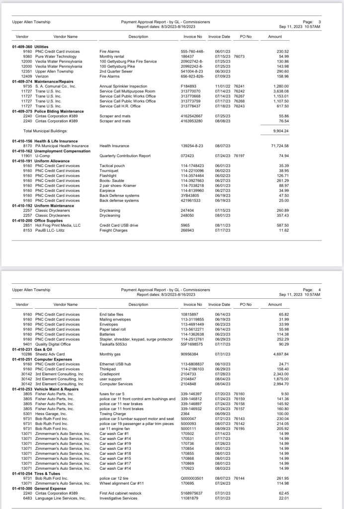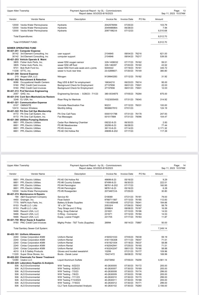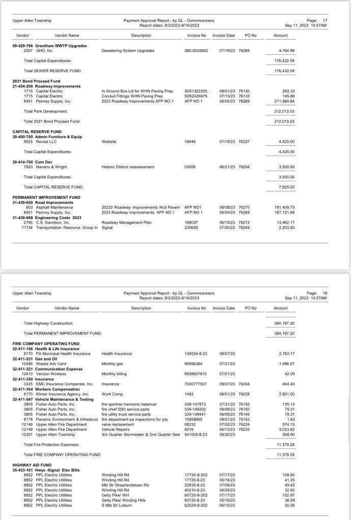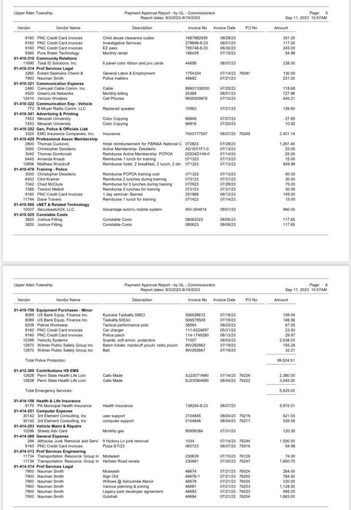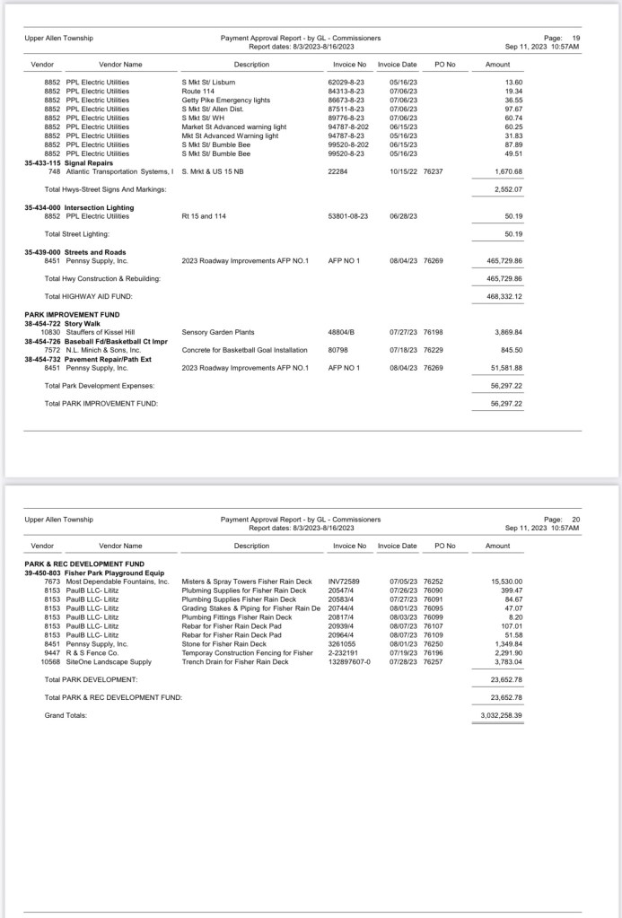 A listing of $3,032,258.39 Bills Approved at the August 16, 2023 Commissioners (BOC) Meeting was recently requested. The township provided this information; however, not in a format that can be linked. Here is a detailed look at how Upper Allen spends taxpayer money: