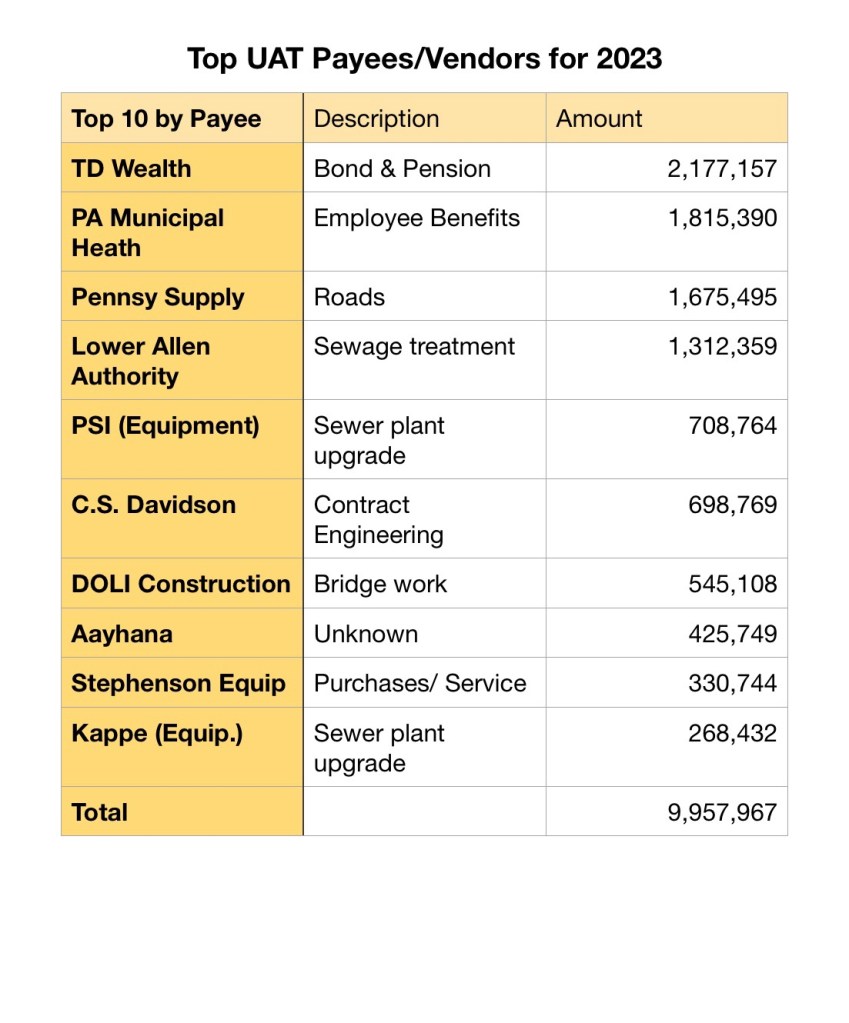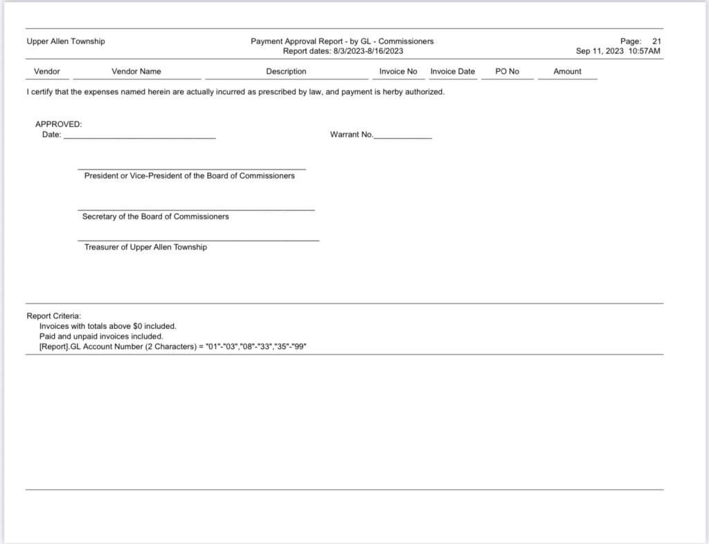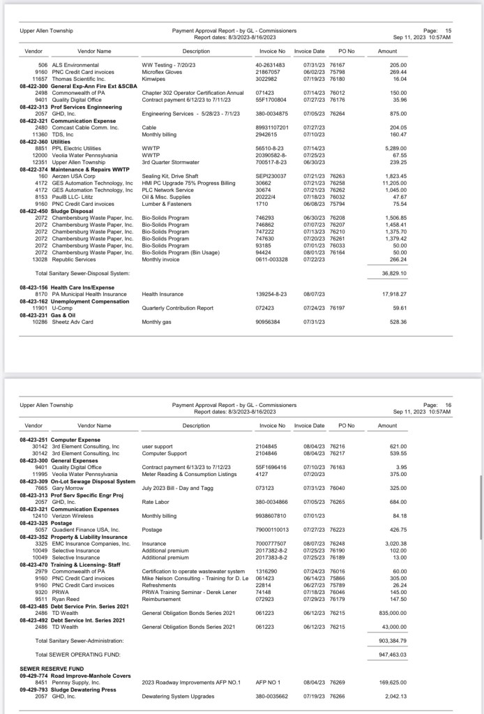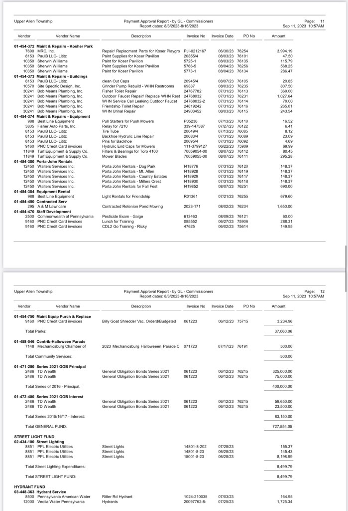 A listing of $3,032,258.39 Bills Approved at the August 16, 2023 Commissioners (BOC) Meeting was recently requested. The township provided this information; however, not in a format that can be linked. Here is a detailed look at how Upper Allen spends taxpayer money: