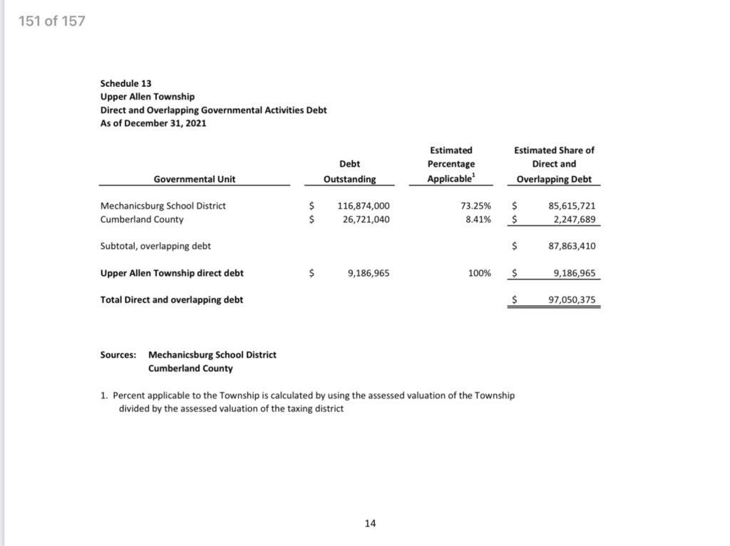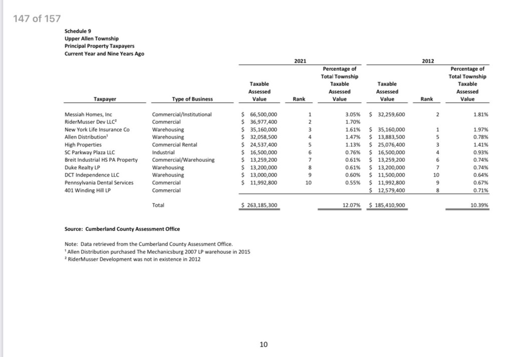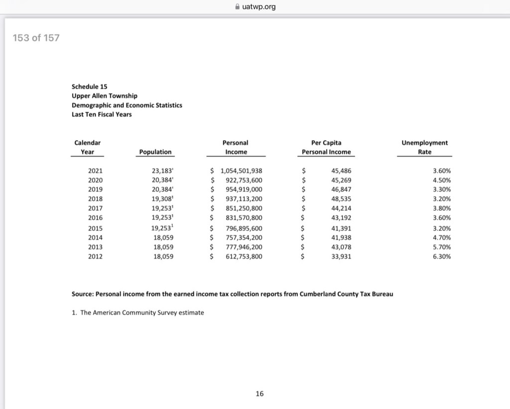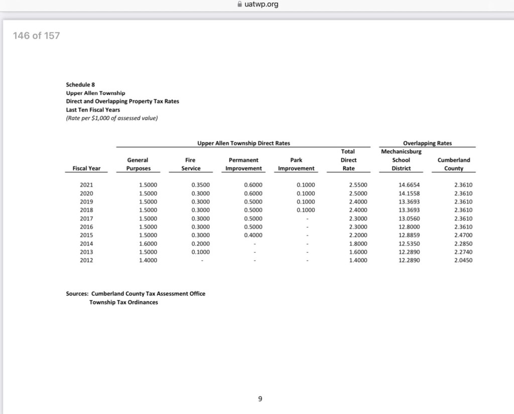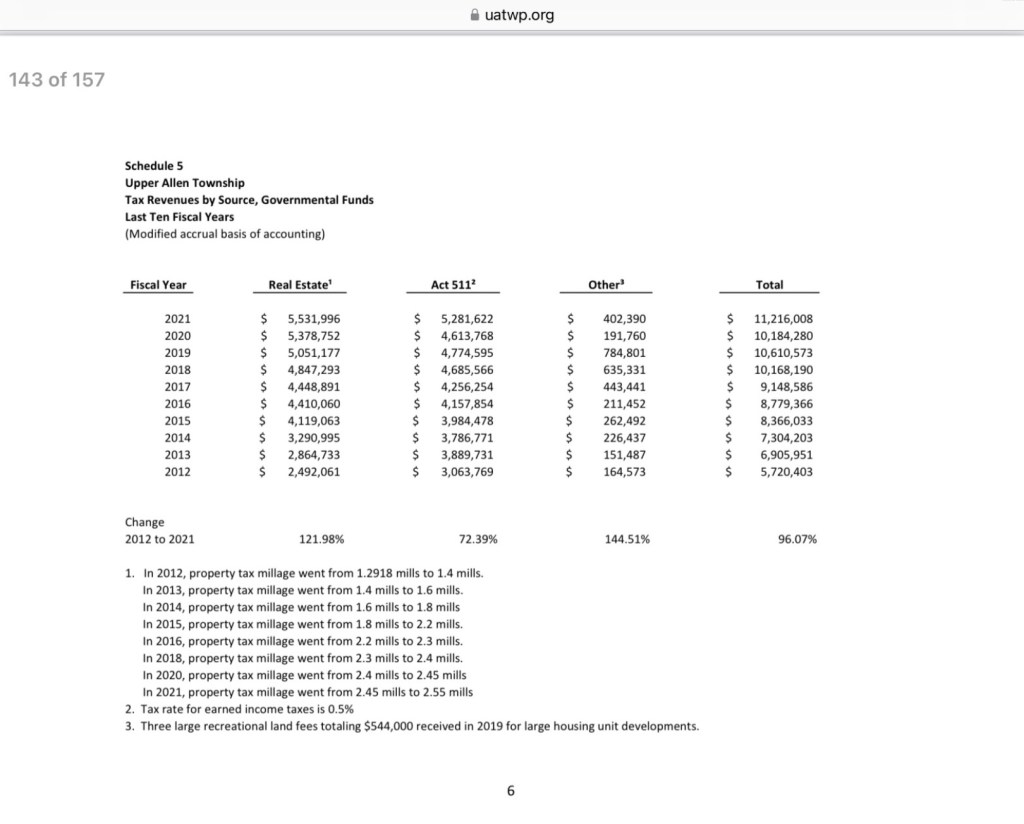 Upper Allen’s property tax millage has doubled in the past 10 years (1.29 to 2.55 mills). Upper Allen also gets .5% of the 1.70% collected by the earned income tax (See Schedule 5).