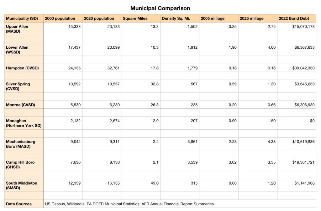 The data clearly shows Upper Allen has been much more aggressive in raising taxes than surrounding municipalities for over 20 years. In addition to pushing for more development, the majority Commissioners keep pushing for state of the art facilities, sports fields and parks.