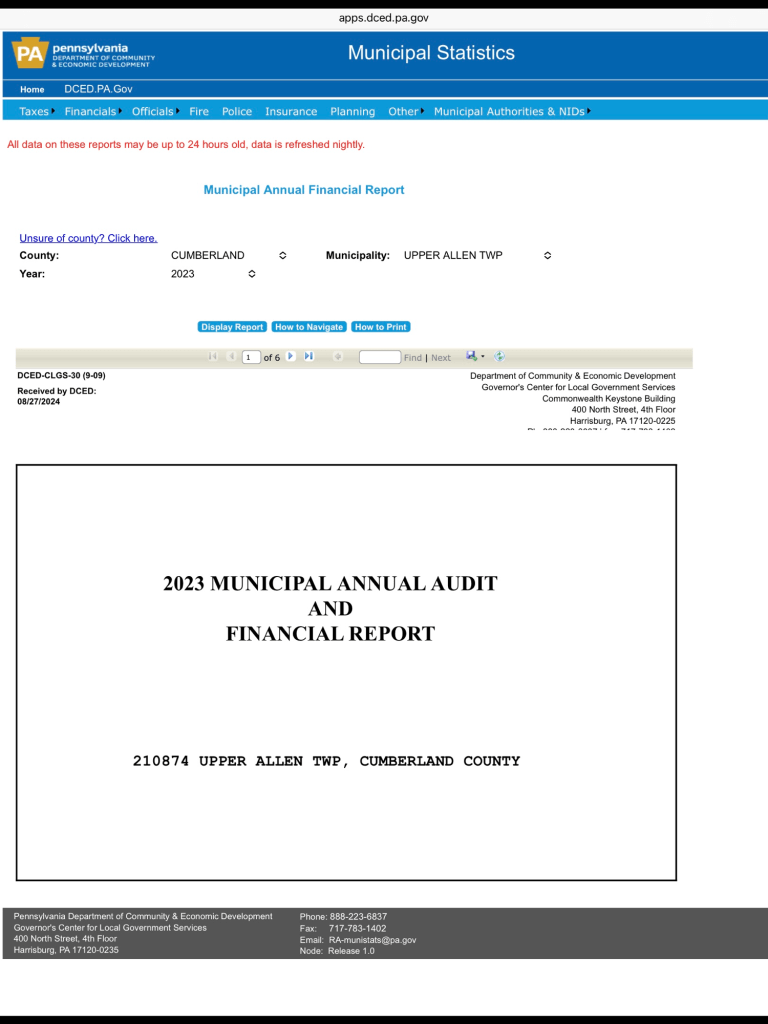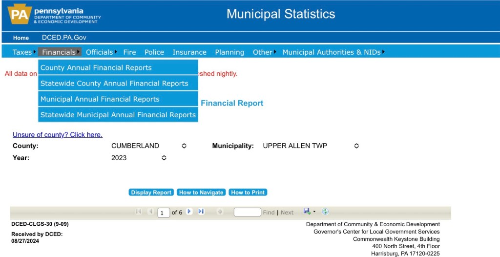 One of the better ways to learn about Township finances in Pennsylvania is to check out the Municipal Statistics page from the PA Department of Community and Economic Development (DCED). Below is a link to the DCED web page and a screen shot of what you will find.