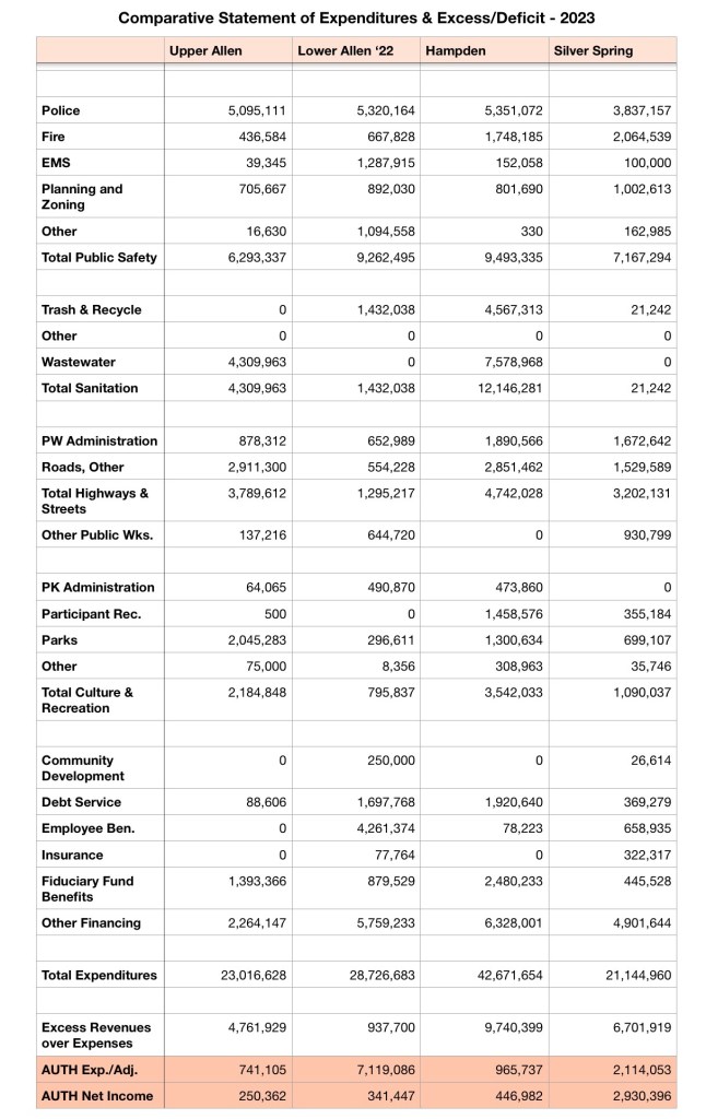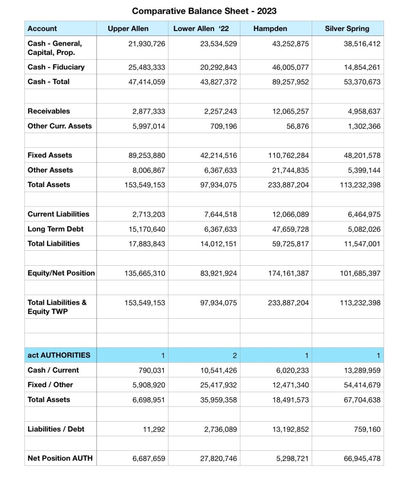 We offer this information as a way to educate residents and to show we have taken a serious look at Upper Allen’s finances. Knowing how Upper Allen does things as compared to other municipalities is important for determining the best path forward.