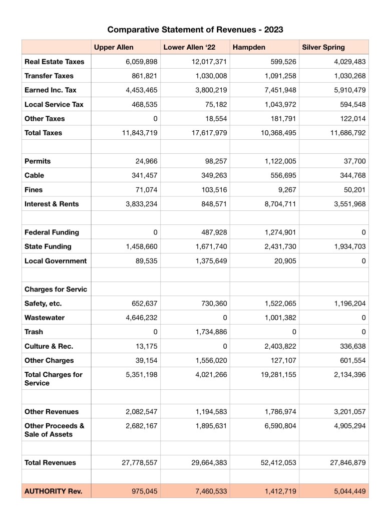 The Municipal Authorities tab is important because many municipalities run their Sewer or Stormwater services through an authority which reports separately. So, the authorities need to be considered as part of the overall picture. For example, Upper Allen runs its Sewer in-house vs. Lower Allen and Silver Spring which have separate Authorities for sewer.