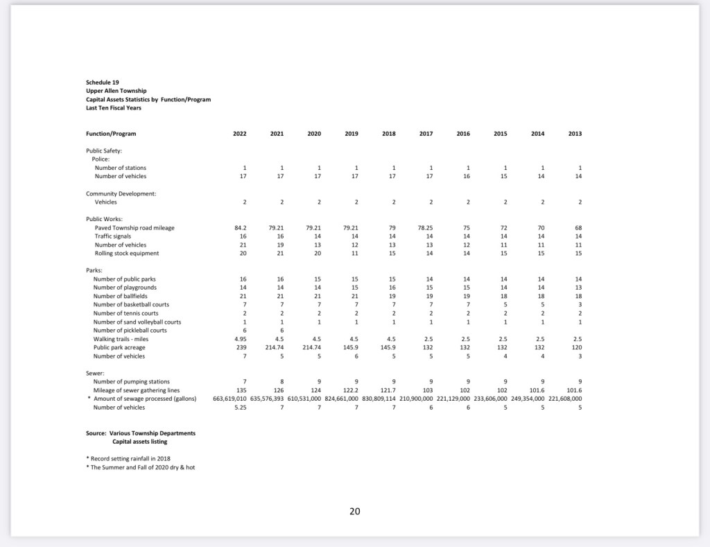 Here is a summary of Capital Assets per the 2022 Annual Comprehensive Financial Report. We note obfuscation regarding how many soccer, baseball and softball fields Upper Allen has – they’re all lumped together as “ballfields”: