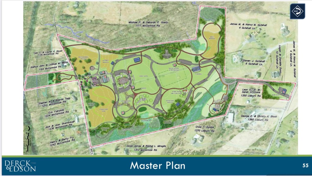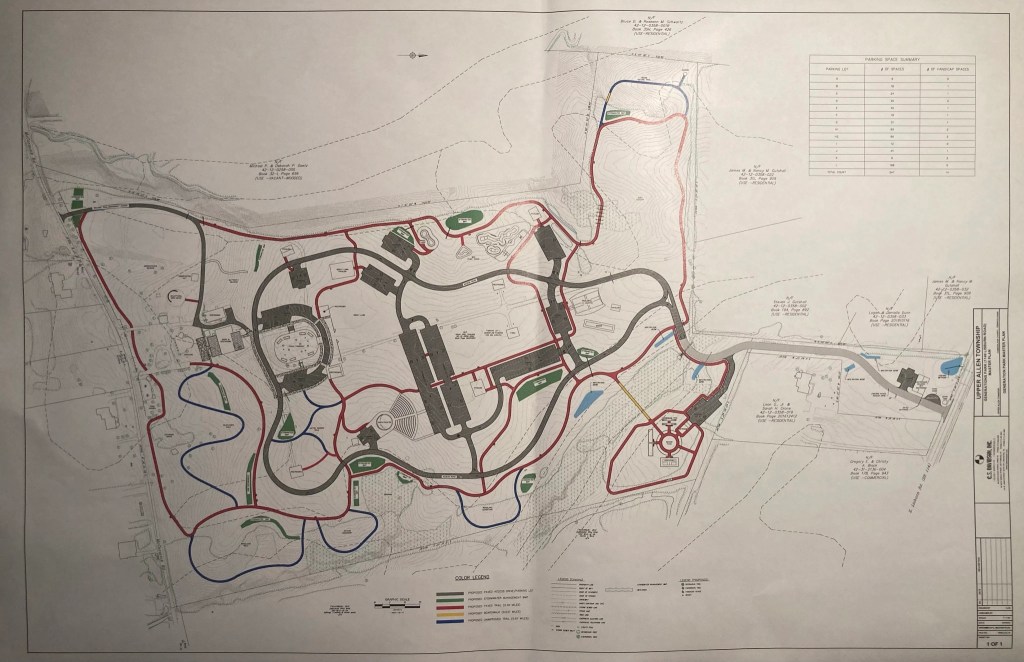 A skatepark is still shown even though one is soon to be built at Koser Park. A 660 seat Amphitheater is still shown even though it garnered only 4% of the “acorn” votes at the public input sessions. 8 restrooms are still shown and the township has filed a lawsuit against a neighbor (Gutshall Estate) in an apparent attempt to aid in extending sewer to the site. The engineer has still not provided a cost estimate for the cost of infrastructure. This is no way to build a railroad.