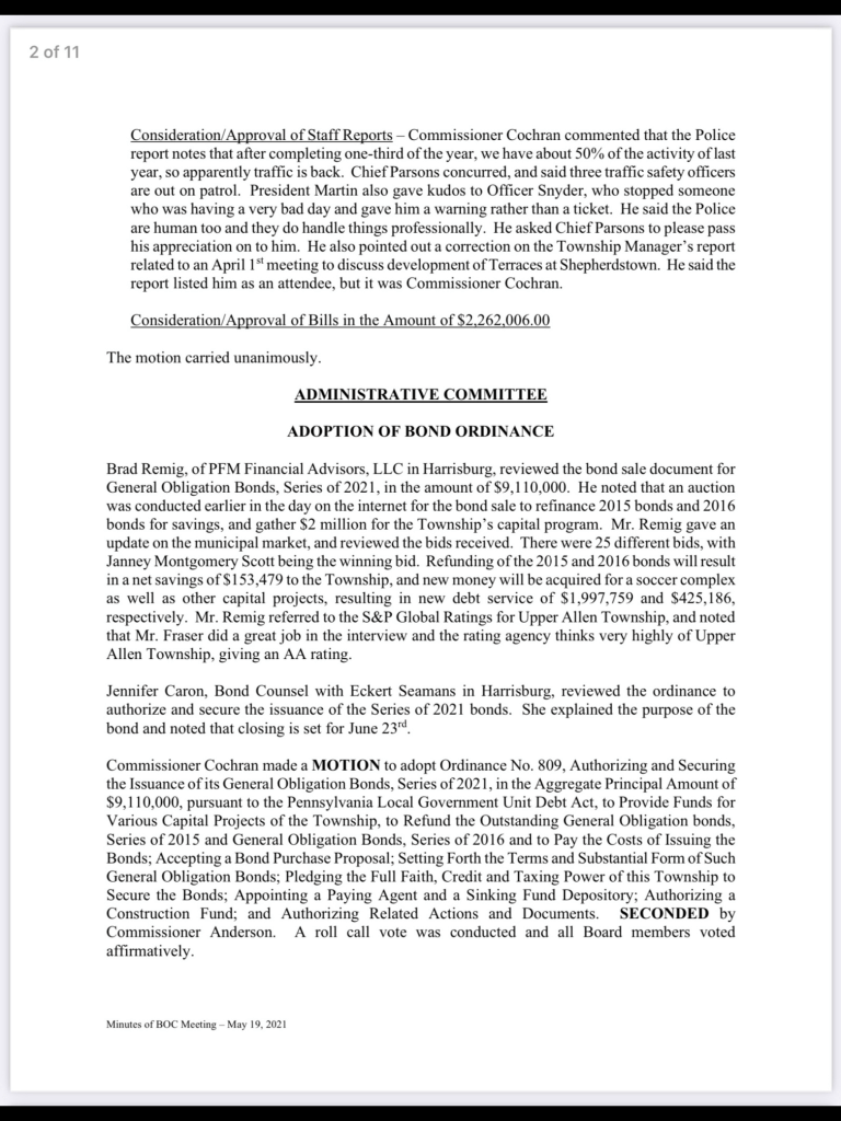 Upper Allen is also spending money on Parks outside the budget process through “Fund 21 2021 Bond Proceed Fund”. This comes from the additional $2 million borrowed in 2021 for a soccer complex and there is now about $300,000 left in this fund. Commissioner Fairchild has objected to not including these funds in the budget as it masks spending and accountability.