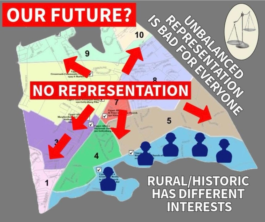 Judy and Marjorie’s primary opponents have been trying to make an issue about representation and how – if Judy and Marjorie are elected – there would be too many Upper Allen Commissioners living in Precinct 2. They offer maps worthy of illustrating the Battle of Gettysburg.