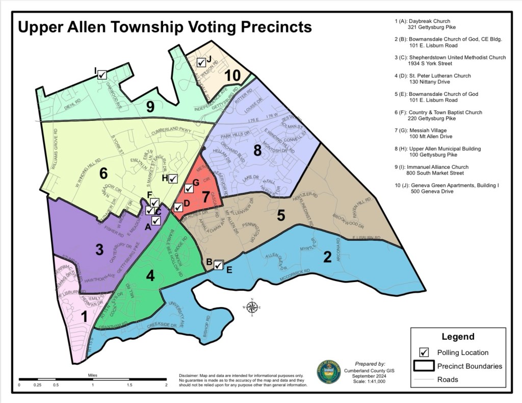 A map of Upper Allen Township voting precincts and polling locations for 2025 is as shown above.