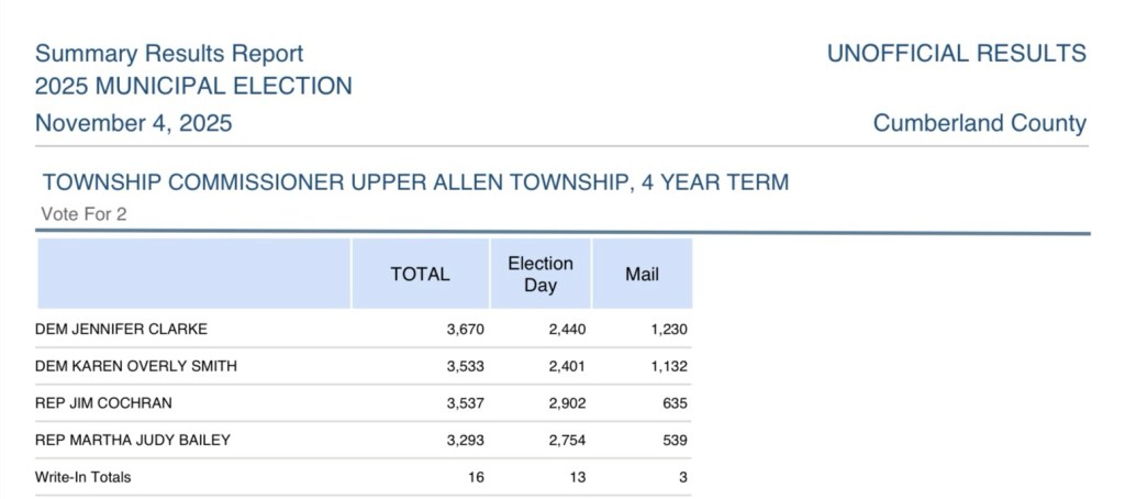 Here are the unofficial election results for Upper Allen Township Commissioner per Cumberland County Bureau of Elections.