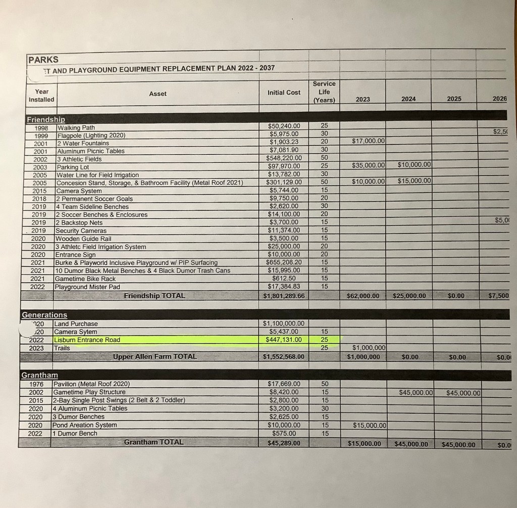 Township staff has also failed to provide me with a requested accounting of approximately $2 million of funds from the 2021 Bond issue. This money was originally intended to “3) fund various capital projects of the Township, including the planning, designing, acquiring, constructing, furnishing and equipping of a turf soccer field and stadium…”
