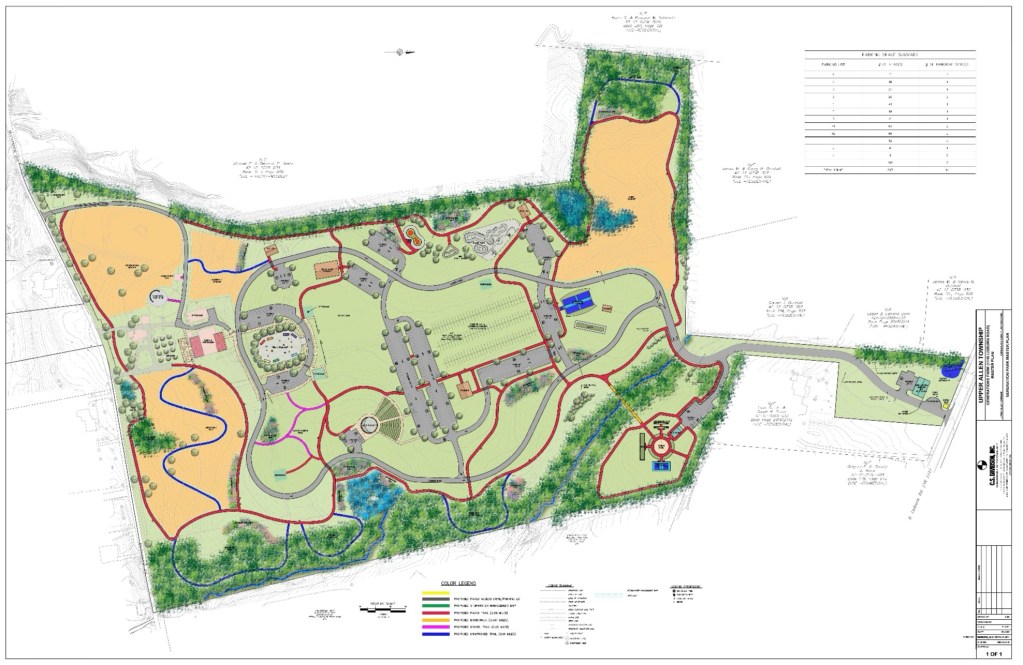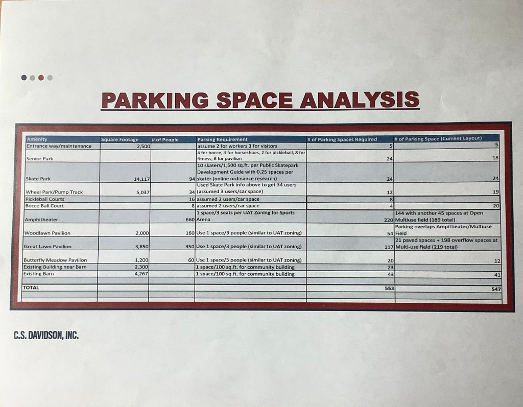In studying the C. S. Davidson master plan (not shown on the township website) and its 547 parking space configuration, it becomes apparent that a soccer or lacrosse (turf) field could easily be placed on the indicated grass parking area in the future. See the area near the center with parking lines and parallel 8 ft. trails.