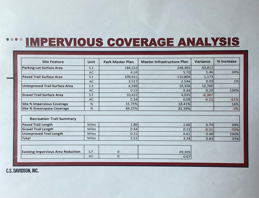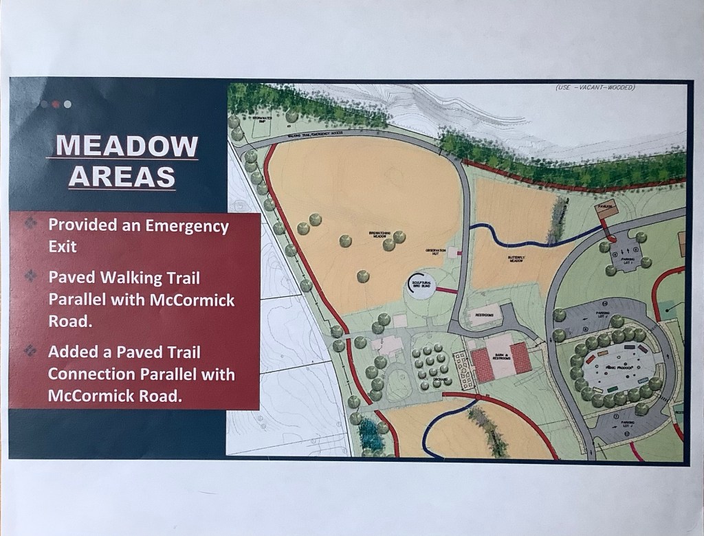 There are differences in the trails now proposed vs. those proposed in the 2022 County grant application. A trail parallel to McCormick Rd. has been added and boardwalk and trail near the Senior Area is now being omitted. This could be viewed as bait and switch.