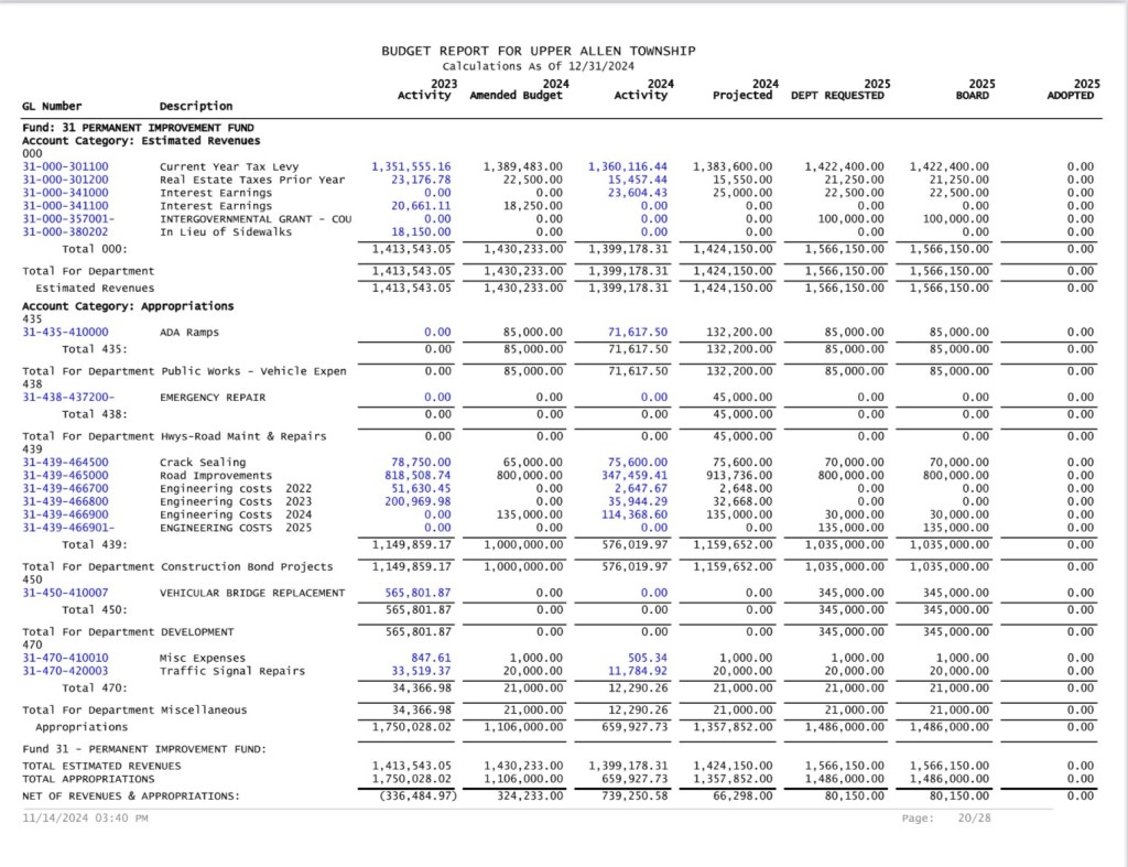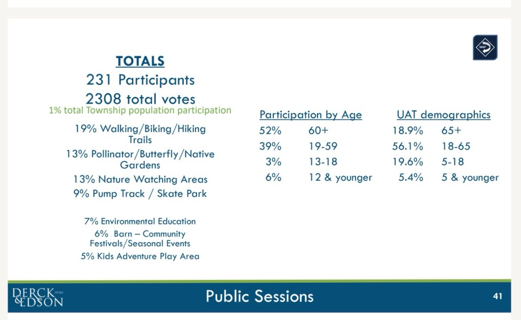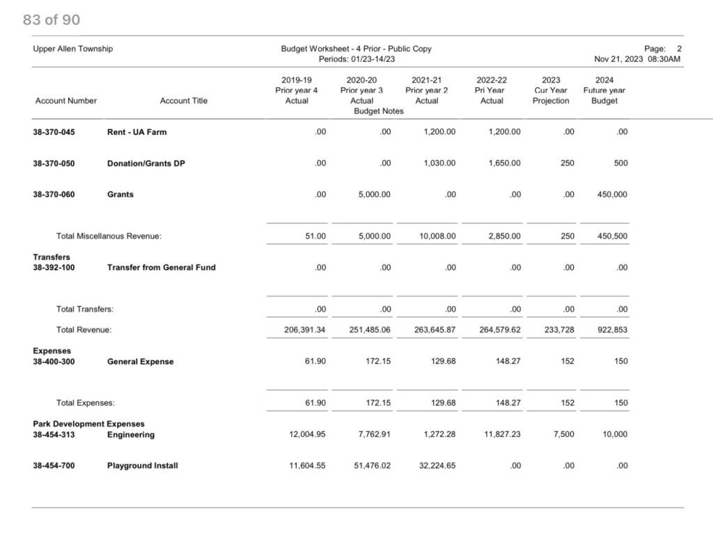 My understanding is that the township has been paying C.S. Davidson for Generations Park design work directly from the bond fund; however, we won’t know the full extent until we have an accounting. These payments likely exceed $200,000 and are not shown in the budget. The amount shown in the 2024 budget for Park Development Engineering (see pg. 83 of budget) is $10,000.
