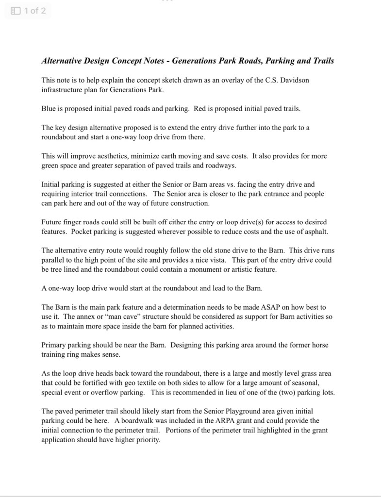 Even without response from staff or Davidson; it is clear that substantial $ could be saved by: minor changes to the entry drive, adding a roundabout, using pocket parking, eliminating a number of redundant trails, and using the former farmhouse driveway for emergency access to the barn.