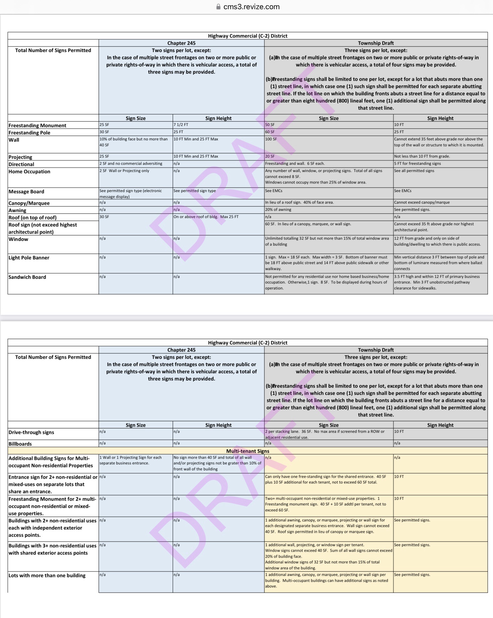 Total square footage (sf) of signage could easily double or triple under this proposal. The increases can be seen in the Comparison Chart(s) and Potential Electronic Message Centers (EMC’s) map that has been prepared by township staff at the above link.