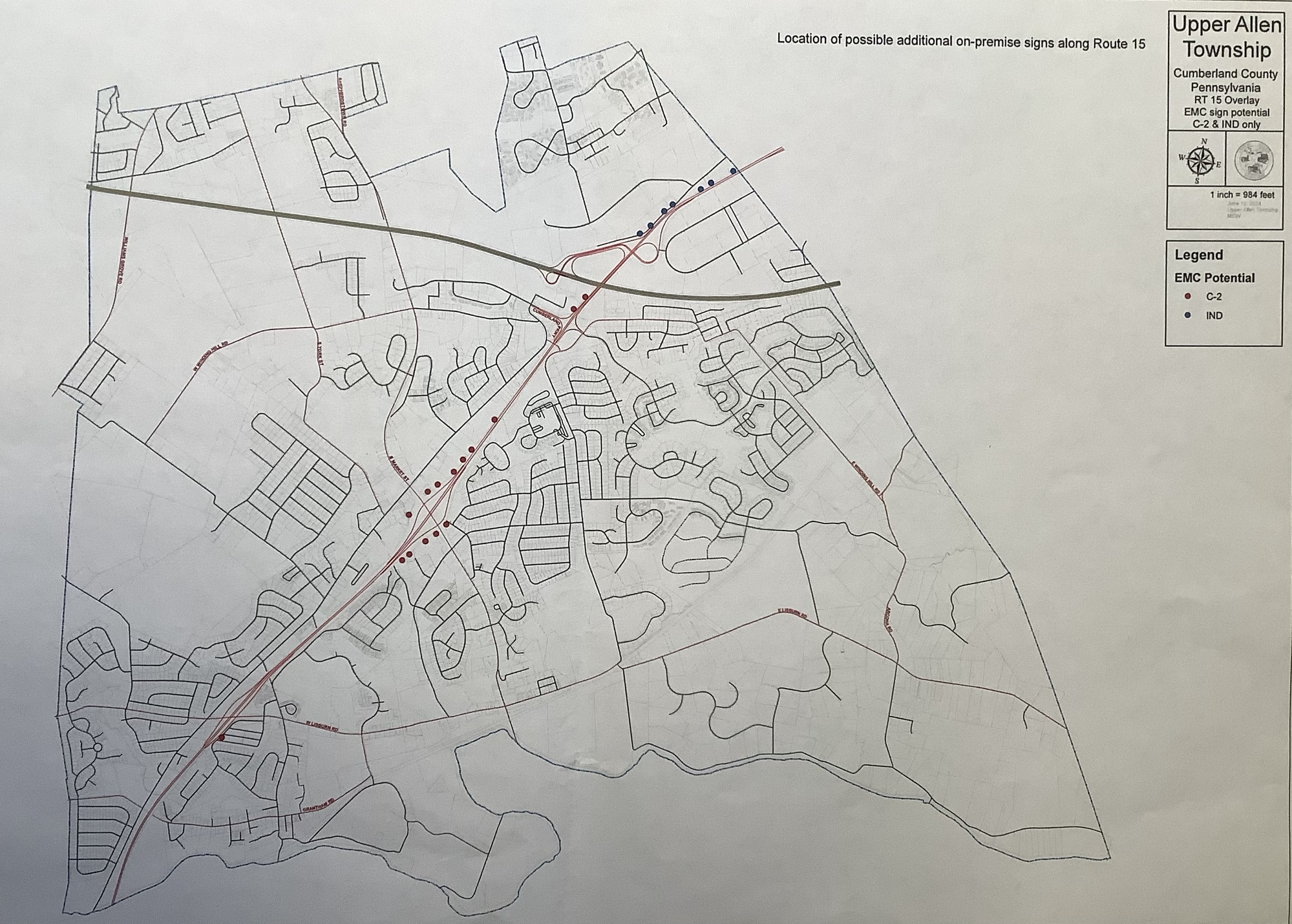 Township staff has kindly developed another map of additional signs that (could be) permitted under the proposed Sign Ordinance amendment. This map includes the PA Turnpike area in addition to the prior map which was for Rt. 15 only. The hearing is this afternoon at 4:00 pm. Public comment is also being accepted on the township website at: