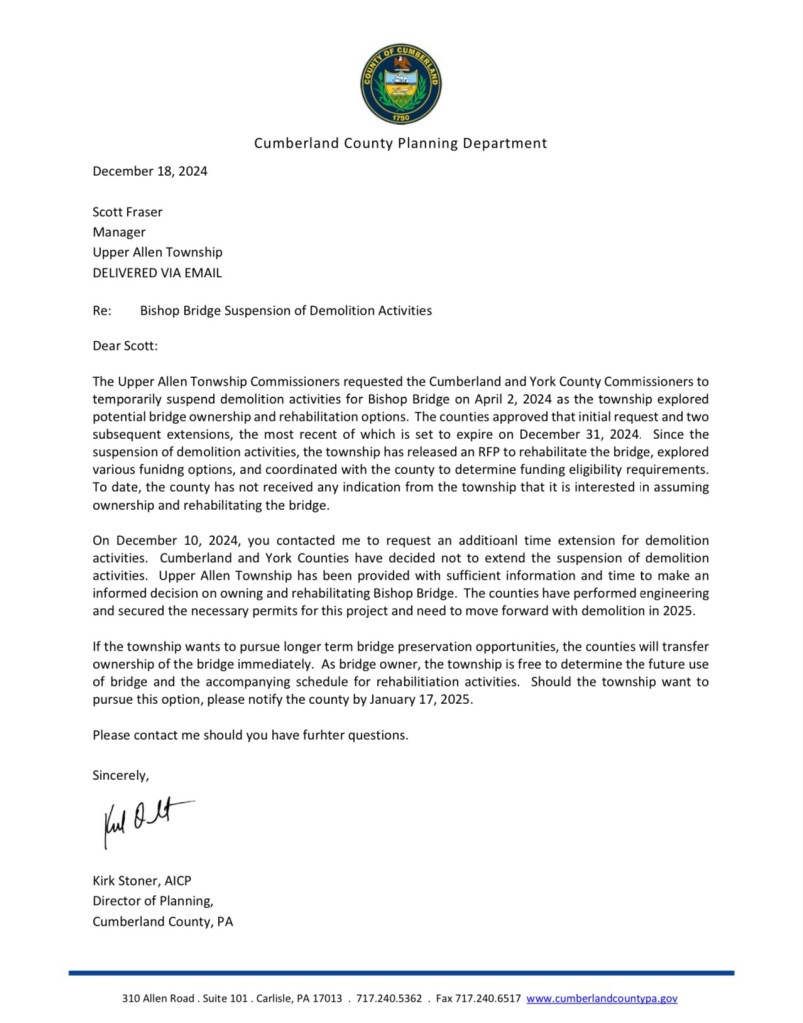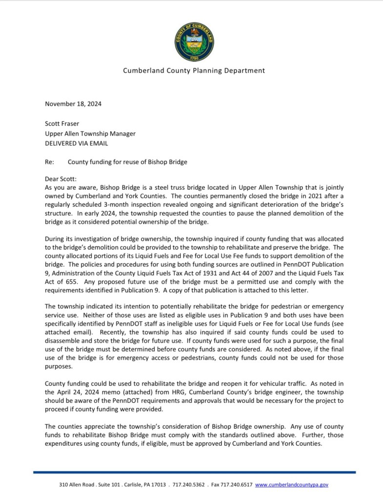 Bishop Bridge will be on the Upper Allen Board of Commissioners Agenda for December 3, 2025 and on the Cumberland County Commissioners Agenda forDecember 4, 2025.