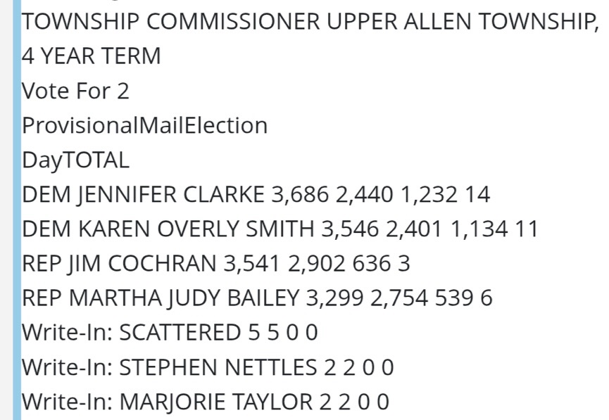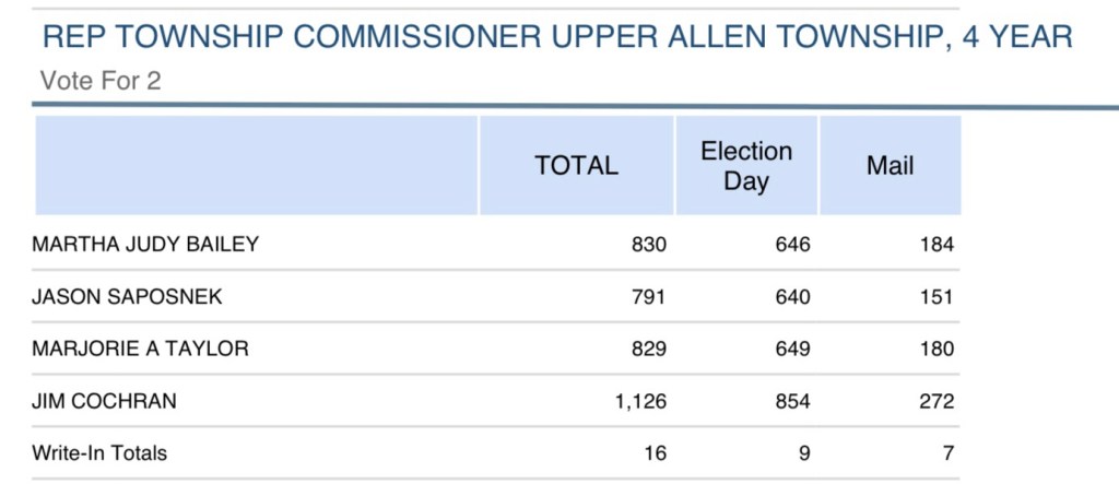 Here are the unofficial election results for Upper Allen Township Commissioner per Cumberland County Bureau of Elections.