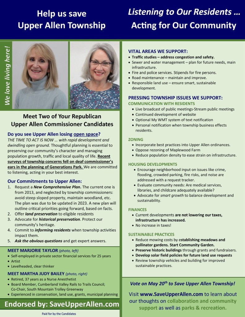 Marjorie Taylor, Martha Judy Bailey, and the organization Save Upper Allen are independent voices committed to representing the interests of the residents of Upper Allen Township. Each brings a strong dedication to transparency in local governance, a creative and inclusive approach to community problem-solving, and a deep respect for the township’s historical and cultural heritage. Together, they advocate for a more engaged, informed, and forward-thinking local government.